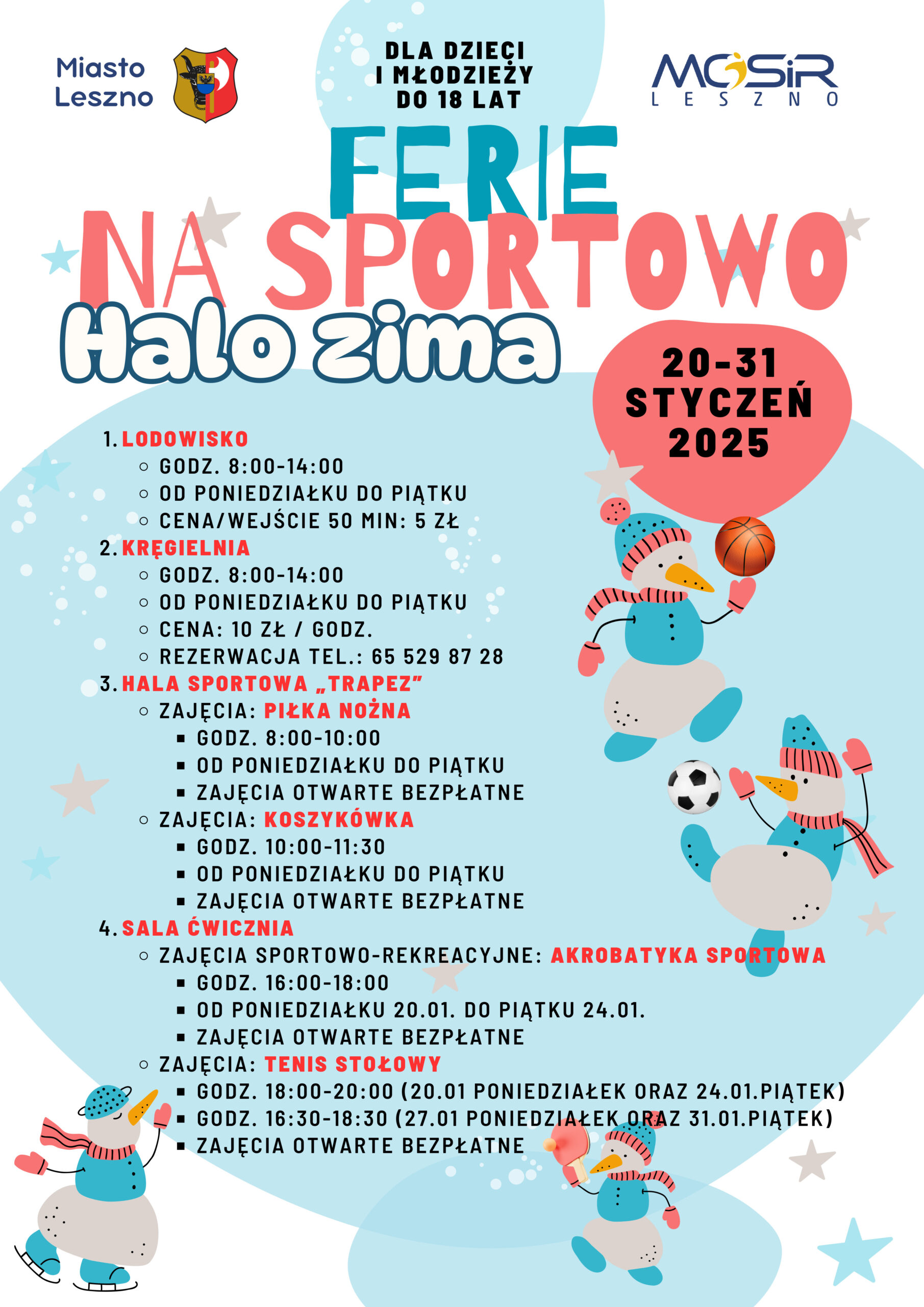 20 stycznia rozpoczną się ferie zimowe. Dla dzieci i młodzieży do 18 lat przygotowaliśmy specjalną ofertę – ,,Halo zima. Ferie na sportowo”. W programie dwutygodniowych zajęć znajdują się m. in. akrobatyka sportowa, kręglarstwo, koszykówka, piłka nożna, tenis stołowy. Zajęcia zaplanowano od poniedziałku do piątku, w g. 8.00-14.00. Zapraszamy dzieci i młodzież. Zajęcia są bezpłatne. Jedynie korzystanie z lodowiska kosztuje 5 zł oraz z kręgielni 10…